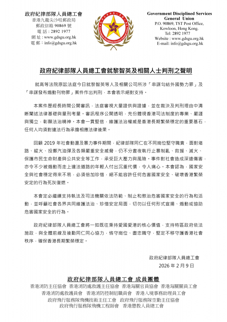 政府紀律部隊人員總工會就黎智英及相關人士判刑之聲明 (9.2.2026)
