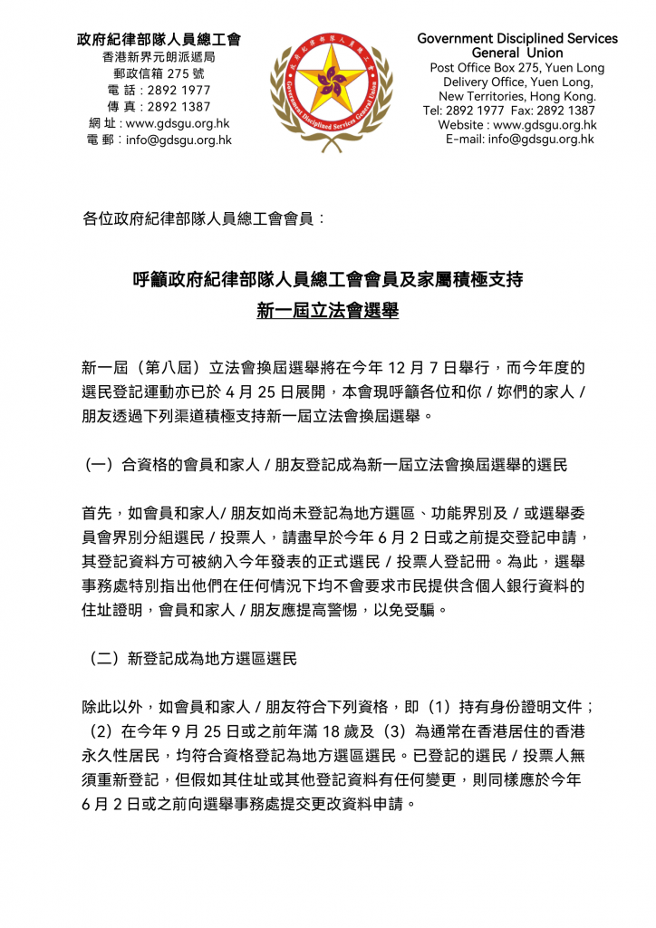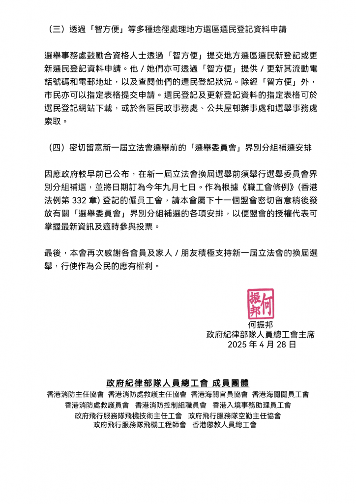 呼籲政府紀律部隊人員總工會會員及家屬積極支持新一屆立法會選舉 (28.4.2025)